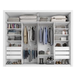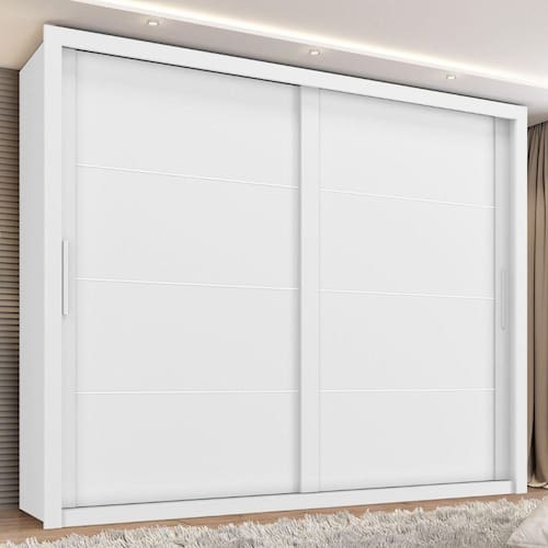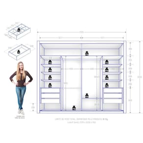 Características: Estrutura em MDP 2 Portas de correr 6 Gavetas Colmeias organizadoras Puxadores em MDF Trilho inferior de alumínio Trilho superior de plástico Sistema com rolamentos e freios Corrediças telescópicas Cabideiros metálicos Peso suportado pelo produto: 81 kg