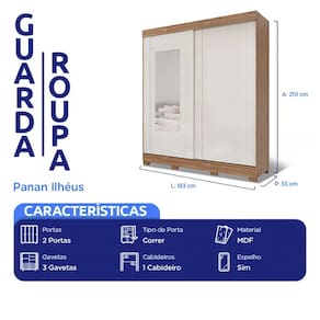 Características: Marca: Panan Modelo: Ilhéus Tipo: Casal Tipo de porta: Correr Quantidade de portas: 2 portas Quantidade de gavetas: 3 gavetas Quantidade de cabideiros: 1 cabideiro Sapateira: Sim Espelho: Sim Tamanho do espelho: 119,2 x 45 cm Espessura do espelho: 3 mm Gaveta com chave: Não Tipo de corrediças: Telescópicas Material da estrutura: MDF Pés: Sim Material dos pés: ABS