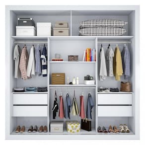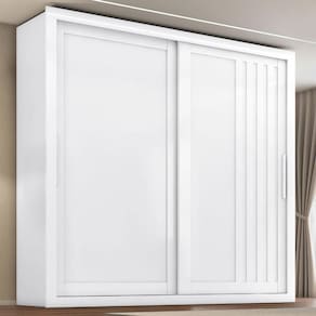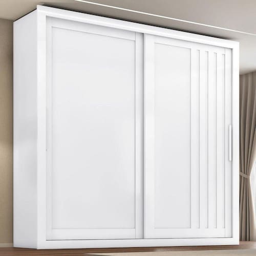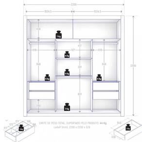 Características: Estrutura em MDP 2 Portas de correr 4 Gavetas Corrediças telescópicas Cabideiros metálicos Trilho inferior de alumínio e trilho superior de plástico Sistema com rolamentos e freios Produto suporta, no total, 44kg