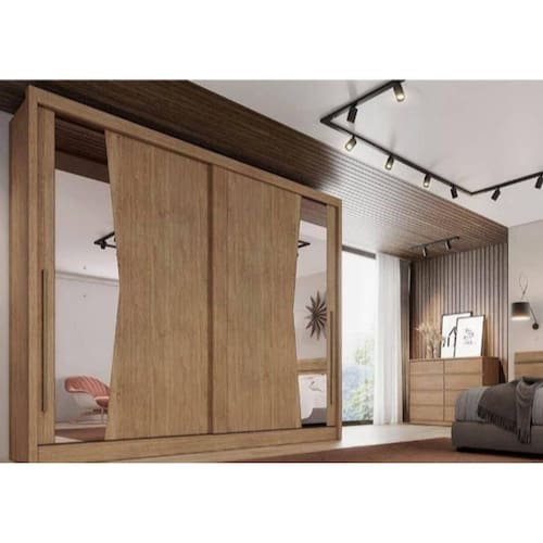 Guarda Roupa Casal com Espelho, 02 Portas de Correr e 8 Gavetas Geom Plus Novo Horizonte. O Roupeiro Geom Plus Novo Horizonte é fabricado em 100% MDF, colunado em MDF 25mm para maior resistência e elegância, possui 02 portas de correr, portas encabeçadas em MDF 25mm, espelhos bipartidos e parafusados nas duas portas, 8 gavetas internas com corrediças telescópicas e puxadores, trilho inferior em alumínio, roldanas com rolamento, roldana superior com rolamento e freio, roldanas inferiores com amortecedores, cabideiros e calceiros em alumínio.