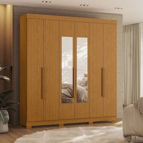 Com seis portas de dobradiças metálicas, sendo duas delas com espelho, o Guarda Roupa proporciona um acesso amplo e fácil ao interior, permitindo que você armazene suas roupas de forma eficiente. Seu design moderno é complementado por puxadores de MDF revestidos, que conferem um acabamento refinado e sofisticado, enquanto os três cabideiros de alumínio oferecem a solução perfeita para pendurar roupas com praticidade e organização. Além disso, o Guarda Roupas 6 Portas conta com três gavetas equipadas com corrediças telescópicas, garantindo um deslizamento suave e durável. A combinação das gavetas com os cabideiros proporciona um equilíbrio entre espaço para pendurar e armazenar, oferecendo versatilidade para as suas necessidades diárias. Os pés inclusos no design do não apenas conferem um toque de modernidade ao visual, mas também facilitam a limpeza, mantendo o móvel levemente elevado do chão. Com uma estrutura sólida e funcional, é a escolha ideal para quem busca um móvel durável, organizado e com um design elegante, capaz de otimizar o Quarto de Casal de forma prática e sofisticada. É a solução perfeita para quem deseja manter o ambiente ordenado e, ao mesmo tempo, adicionar um toque de sofisticação ao seu quarto ou closet.