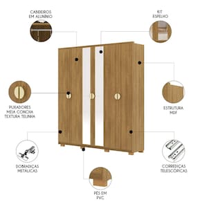 Sua divisão interna foi pensada para facilitar a organização. São quatro gavetas de abertura total com corrediças telescópicas, cabideiros em alumínio e prateleiras internas, proporcionando excelente aproveitamento de espaço e facilitando a organização das suas roupas e acessórios de forma eficiente.