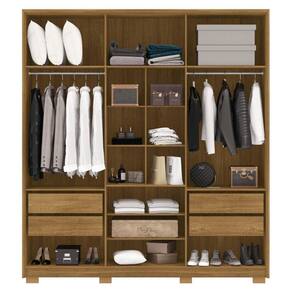 Sua divisão interna foi pensada para facilitar a organização. São quatro gavetas de abertura total com corrediças telescópicas, cabideiros em alumínio e prateleiras internas, proporcionando excelente aproveitamento de espaço e facilitando a organização das suas roupas e acessórios de forma eficiente.