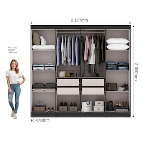 O Guarda-Roupa Slim é uma exelete opção para quem busca praticidade e estilo para seu quarto. Acabamento da Prateleira: Pintura Escala de Brilho da Prateleira: Fosco Possui Cabideiros: Sim Acabamento da Gaveta: Pintura Possui Organizador de Gaveta: Não Acabamento da Porta: Pintura UV Escala de Brilho da Porta: Fosco Ambiente Principal: Quarto codigo_ean: 7900288178015 Complexidade da Montagem: Média: pode ser montado por mais de uma pessoa e/ou necessite de maior conhecimento para montagem Cor: Preto Cor da Porta: Preto Cor do Produto: Preto Cor do Puxador: Marrom Cor Interna: Cinza Escala de Brilho: Fosco Espessura da Estrutura (mm): 12 mm Espessura das Portas (mm): 15 mm Espessura das Prateleiras (mm): 12 mm Espessura do Fundo (mm): 3 mm Espessura do Fundo das Gavetas (mm): 3 mm Itens Inclusos: 1 Guarda-Roupa, Ferragens e Manual de Montagem Linha ou Coleção: Slim Manual de Montagem e Instalação: https://product-hub-prd.madeiramadeira.com.br/534231904/documents/ba09f00c-fc0f-4d48-86c9-6c535790f8fb3009853286417504492117639.pdf Marca: Maxel Material da Gaveta: MDP Material da Porta: MDP Material da Prateleira: MDP Material Principal: MDP modular: Não Necessita Montagem: Sim Origem do Produto: Nacional Peso: 126,65 kg Peso Máximo por Gaveta: 3 kg Peso Máximo por Prateleira: 6 kg Possui Calceiros: Não Possui Espelho: Não Possui Pés: Não Possui Portas: Sim Possui Prateleiras: Sim Produto Montado: Sim Quantidade de Cabideiros: 02 Cabideiros Quantidade de Gavetas: 04 Gavetas Quantidade de Prateleiras: 06 Prateleiras Recomendações de Uso, Manutenção e Limpeza: Pano seco ou levemente umedecido, não usar produtos abrasivos Sistema de Montagem: Parafusos, cavilhas, pregos e dispositivos plásticos. Tipo de Corrediça da Gaveta: Metálica Telescópica Tipo de Dobradiça/Corrediça da Porta: Metálica Tipo de Gaveta: Interna Tipo de Guarda-Roupa: Casal Tipo de Puxador da Gaveta: Não Possui Tipo de Puxador da Porta: Externo