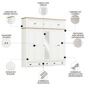 Conta com dez portas equipadas com dobradiças metálicas com amortecimento, garantindo maior durabilidade e um fechamento suave. Dentre essas, uma Porta Com Espelho adicionando um toque de elegância ao ambiente.