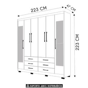 A divisão interna do Guarda Roupa é altamente personalizável, com cabideiros de alumínio que podem ser montados em duas alturas, permitindo uma adaptação perfeita às suas necessidades de organização. Além disso, o modelo conta com várias prateleiras e maleiros amplos, oferecendo espaço suficiente para organizar roupas, sapatos e outros itens com facilidade.