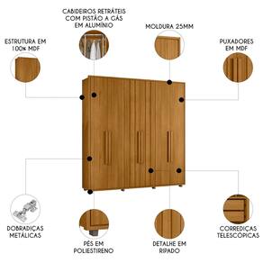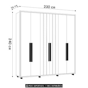 As seis portas convencionais contam com dobradiças metálicas já com sistema de amortecimento, garantindo um fechamento suave e silencioso. As prateleiras internas bem distribuídas acomodam diferentes tipos de itens, desde bolsas, sapatos até malas. Os puxadores em MDF reforçam o visual minimalista.