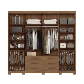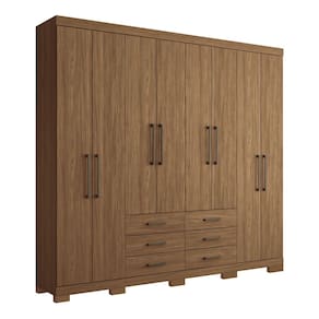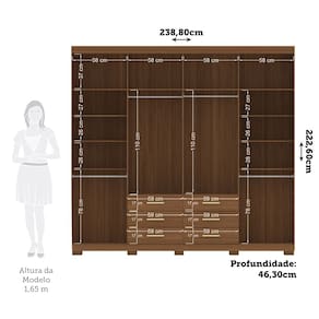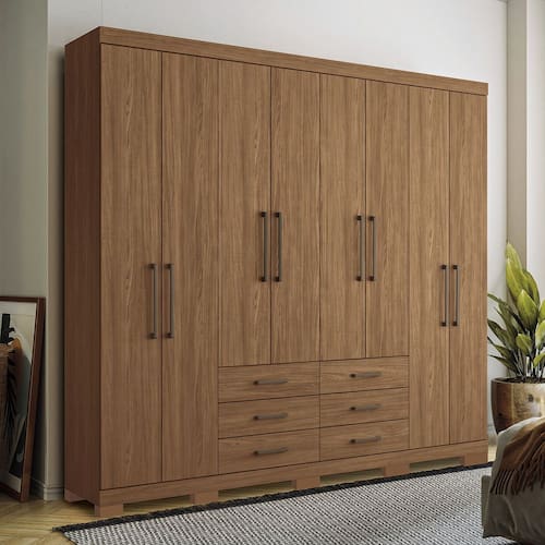 Características: Estrutura: MDP 12mm e 15mm Acabamento: Pintura UV e Verniz Quantidade de Portas: 8 de Bater Tipo de Dobradiças: Metálicas Simples Quantidade de Gavetas: 6 Tipo de Corrediças: Metálicas Telescópicas Quantidade de Prateleiras: 10 Tipo de Puxador: Plástico ABS Quantidade e Tipo de Cabideiros: 4 em Alumínio Tipo de Pés: 10 Pés em PVC Suporte até: Gavetas suportam até 3kg cada e prateleiras até 8kg cada Sistema de Montagem: Cavilhas, Parafusos e Minifix Itens Inclusos: 1 Guarda Roupa, Kit Ferragens e Manual de Montagem Garantia: 3 meses Manutenção: Não limpar com álcool ou qualquer outro produto químico, utilize somente pano seco ou levemente umedecido.