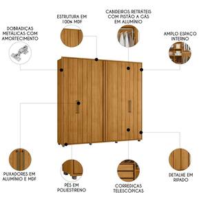 As portas convencionais do Guarda Roupa Casal contam com dobradiças metálicas com amortecimento, oferecendo um fechamento suave e silencioso. São seis portas com prateleiras internas que facilitam a organização e acomodação dos mais diversos itens. Os puxadores em MDF, combinados com puxadores laterais em alumínio, complementam o design moderno e funcional.