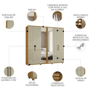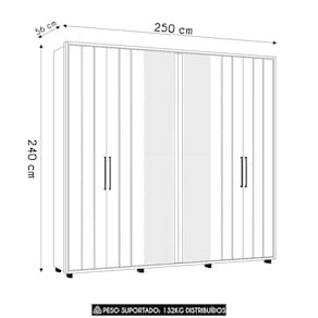 As portas convencionais do Guarda Roupa Casal contam com dobradiças metálicas com amortecimento, oferecendo um fechamento suave e silencioso. São seis portas sendo duas centrais com espelho, e prateleiras internas que facilitam a organização e acomodação dos mais diversos itens. Os puxadores em MDF, combinados com puxadores laterais em alumínio, complementam o design moderno e funcional.
