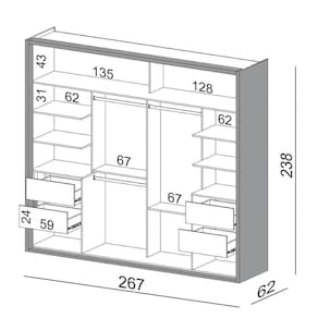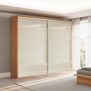 Esse guarda roupa com porta de correr é perfeito para quem quer otimizar espaço no quarto de casal, pois as portas com abertura deslizante não atrapalham a circulação do ambiente. Além disso, o seu design com 267cm possui um excelente compartimento interno com várias prateleiras, 4 gavetas e cabideiros, itens perfeitos para manter tudo no lugar e facilitar a visualização das peças.