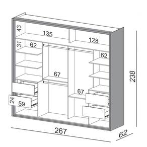 quarto de casal, pois as portas com abertura deslizante não atrapalham a circulação do ambiente. Além disso, o seu design com 267cm possui um excelente compartimento interno com várias prateleiras, 4 gavetas e cabideiros, itens perfeitos para manter tudo no lugar e facilitar a visualização das peças.