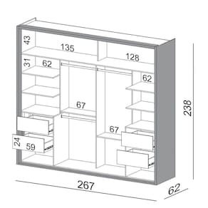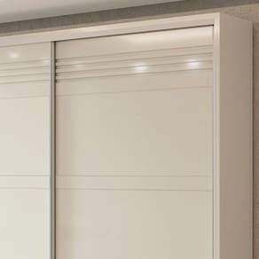 quarto de casal, pois as portas com abertura deslizante não atrapalham a circulação do ambiente. Além disso, o seu design com 267cm possui um excelente compartimento interno com várias prateleiras, 4 gavetas e cabideiros, itens perfeitos para manter tudo no lugar e facilitar a visualização das peças.