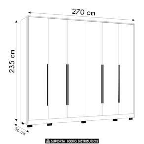 Com seis portas de dobradiças metálicas de alta qualidade, o Guarda Roupa 6 Portas garante uma abertura suave e durável, proporcionando fácil acesso ao interior. Seu sistema de prateleiras internas oferece amplo espaço para acomodar roupas e acessórios de maneira organizada, enquanto os puxadores de MDF revestidos adicionam um toque refinado e moderno ao conjunto. Além disso, o Guarda Roupa conta com seis gavetas equipadas com corrediças telescópicas, que proporcionam um deslizamento suave e facilitam o armazenamento de itens menores, como roupas íntimas e acessórios. Os dois cabideiros de alumínio são ideais para pendurar roupas de forma prática e eficiente, mantendo suas peças sempre bem organizadas e prontas para o uso. A estrutura do móvel é robusta, com uma moldura de 15mm que assegura resistência e estabilidade ao guarda-roupa. Os pés inclusos no design do guarda-roupa não só oferecem um visual moderno e elegante, mas também garantem maior durabilidade e facilidade na limpeza.