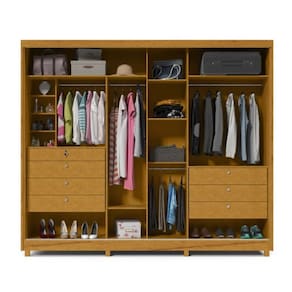 Contando com sete gavetas em seu interno com divisória especial Ele e Ela e, espaço para vestidos, colmeia organizadora, sapateira, amplo maleiro e quatro tubos cabineiros em alumínio, para melhor dividir seus espaços.