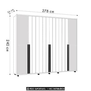 As seis portas com abertura convencional do Guarda Roupa contam com dobradiças metálicas com sistema de amortecimento, oferecendo mais suavidade e durabilidade no uso diário. Duas das seis portas possuem espelho, adicionando um toque de sofisticação e funcionalidade. Além disso, as prateleiras internas e puxadores em MDF, reforçam a estética moderna e clean.
