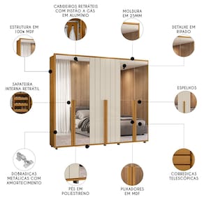 As seis portas com abertura convencional do Guarda Roupa contam com dobradiças metálicas com sistema de amortecimento, oferecendo mais suavidade e durabilidade no uso diário. Quatro das seis portas possuem espelho, adicionando um toque de sofisticação e funcionalidade. Além disso, as prateleiras internas e puxadores em MDF, reforçam a estética moderna e clean.