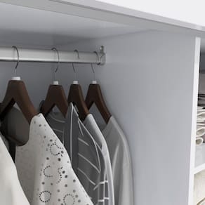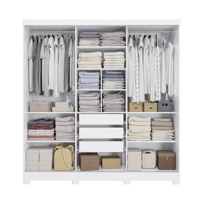 Perfeito para quem busca por muito espaço, na parte interna ele possui divisões iguais dos dois lados, o que garante facilidade na organização e divisão de espaço. E com nichos de tamanhos diferentes, ideais para guardar calçados e roupas dobradas nas prateleiras, ele conta com dois cabideiros metálicos, ideal para peças maiores, como vestidos ou casacos, garantindo mais praticidade. Muito versátil, esse modelo ainda possui três gavetas internas, facilitando a organização de peças menores.