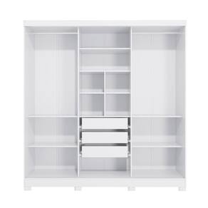 Acabamento: Pintura Brilho | Acabamento da Fita Borda: Papel | Cor: Branco | Corrediças: Metálicas | Garantia: 3 meses para defeito de fabricação | Gavetas: Internas | Matéria-prima: MDP / Polipropileno | Peso suportado por cabideiro: 10 Kg | Peso suportado por cada prateleira: 7 kg | Puxadores: Alumínio | Quantidade de calceiros: 2 | Quantidade de gavetas: 2 | Quantidade de portas: 3 | Quantidade de prateleiras: 9 | Sistema de montagem: Parafuso Philips / Parafuso Philips e Minifix | Tipo de porta: Correr