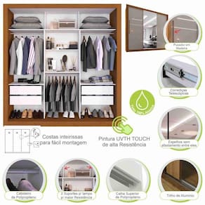 Este lindo Guarda-Roupa Panama com Espelho Salleto e fabricado em MDP/MDF, diferenciado pela sua resistencia, durabilidade, funcionalidade e beleza, ele e a melhor opcao para deixar seu dormitorio mais arrumado e convidativo. Com corredicas telescopicas que permitem uma abertura total das gavetas, Portas de correr com trilho em aluminio com trava de seguranca evitando que a porta se solte do trilho, costa inteirica sem perfil H, parte interna clean toda branca, divisoes internas amplas quem oferecem praticidade e organizacao, contando tambem com sapateira embutida. Se encaixa facilmente em varios estilos de decoracao. Aproveite, voce merece.