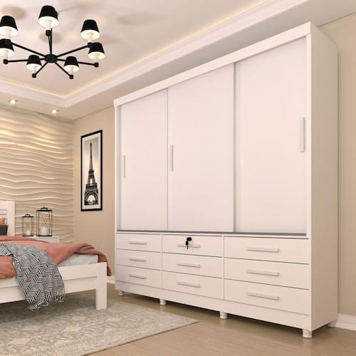 O guarda roupa Chicago possui um design inovador, com material de alta qualidade com cores incríveis. Guarda Roupa em MDP, com corrediças telescópicas, 9 gavetas externas, trilho inferior em alumínio, cabideiros em alumínio, puxadores em PVC. Deixando o ambiente mais harmonioso e lindo. Escala de Brilho da Prateleira: Semi-Brilho Possui Cabideiros: Sim Acabamento da Gaveta: Pintura Escala de Brilho da Gaveta: Semi-Brilho Material do Puxador da Gaveta: PVC Possui Organizador de Gaveta: Não Acabamento da Porta: Pintura Escala de Brilho da Porta: Semi-Brilho Material do Puxador da Porta: PVC Acabamento dos Pés: Pintura Altura dos Pés: 6 cm Altura Máxima dos Pés: 6.0000 Ambiente Principal: Quarto codigo_ean: 7908308768185 Complexidade da Montagem: Alta: deve ser montado por um montador especializado Cor: Neve Cor do Produto: Neve Escala de Brilho: Fosco Linha ou Coleção: Chicago Manual de Montagem e Instalação: https://product-hub-prd.madeiramadeira.com.br/823527/documents/2fb3ef16-0548-4c08-8f64-b00447f2b23ero3portaschicagosemespelho.pdf Material da Gaveta: MDP Material da Porta: MDP Material da Prateleira: MDP Material dos Pés: PVC Material Principal: MDP Necessita Montagem: Sim Origem do Produto: Nacional Peso: 149,24 kg Peso Máximo por Gaveta: 10 kg Peso Máximo por Prateleira: 10 kg Possui Calceiros: 01 Possui Espelho: Não Possui Pés: 08 Possui Portas: Sim Produto Montado: Sim Recomendações de Uso, Manutenção e Limpeza: Não colocar o produto em lugar úmido, não arrastar, limpar somente com pano macio e seco, não expor o produto a incidência de luz solar, não colocar peso superior ao indicado. Sistema de Montagem: Parafusos, Cavilhas e Pregos Tipo de Corrediça da Gaveta: Metálica Telescópica Tipo de Dobradiça/Corrediça da Porta: Metálica Tipo de Gaveta: Externa Tipo de Guarda-Roupa: Casal Tipo de Puxador da Gaveta: Externo Tipo de Puxador da Porta: Externo Ean: 7908308768185