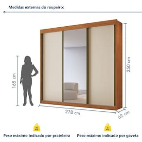 Pode usar como guarda roupa com porta de correr infantil? Claro. Possui espaço de sobra para guardar roupas e brinquedos. Acabamento da Prateleira: Pintura Escala de Brilho da Prateleira: Semi-Fosco Acabamento da Gaveta: Pintura Escala de Brilho da Gaveta: Semi-Fosco Possui Organizador de Gaveta: Não Acabamento da Porta: Pintura UV Escala de Brilho da Porta: Semi-Fosco Altura do Espelho: 225,6 cm Ambiente Principal: Quarto codigo_ean: 7900288132734 Complexidade da Montagem: Média: pode ser montado por mais de uma pessoa e/ou necessite de maior conhecimento para montagem Cor: Cinamomo/Off White Cor do Produto: Cinamomo/Off White Cor Interna: Cinamomo/Off White Escala de Brilho: Semi-Fosco Espessura da Estrutura (mm): 2,5 mm Espessura das Portas (mm): 1,5 mm Espessura das Prateleiras (mm): 1,5 mm Espessura do Espelho: 3 mm Espessura do Fundo (mm): 1,5 mm Espessura do Fundo das Gavetas (mm): 1,5 mm Formato do Espelho: Retangular Gaveta com Chave: Não Guarda-Roupa Suporta Até (kg): 130 kg Itens Inclusos: 1 Guarda-Roupa, Kit Ferragens e Manual de Montagem Largura do Espelho: 89 cm Linha ou Coleção: Chicago Manual de Montagem e Instalação: https://product-hub-prd.madeiramadeira.com.br/502454227/documents/be4823cf-6f34-4051-bdff-d0bc4fb25e9f2876304554117455136996052.pdf Marca: Conquista Móveis Material da Gaveta: MDF Material da Porta: MDF Material da Prateleira: MDF Material Principal: MDF modular: Não Montagem Flex: Não Necessita Montagem: Sim Nicho com Cabideiro: Não Origem do Produto: Nacional Peso: 291,23 kg Peso Máximo por Gaveta: 5 kg Peso Máximo por Prateleira: 10 kg Porta Janelada: Não Possui Calceiros: Não Possui Capelinha: Não Possui Espaço para Vestidos Longos: Sim Possui Espelho: Sim Possui Espelho Interno: Não Possui iluminação: Não Possui Painel de TV: Não Possui Penteadeira: Não Possui Pés: Não Possui Portas: Sim Possui Prateleiras: Sim Produto Montado: Sim Quantidade de Cabideiros: 03 Cabideiros Quantidade de Espelho: 01 Quantidade de Gavetas: 08 Gavetas Quantidade de Portas com Espelhos: 1 Porta com Espelho Quantidade de Prateleiras: 09 Prateleiras Recomendações de Uso, Manutenção e Limpeza: Na limpeza não utilizar produtos químicos e abrasivos usar apenas um pano umedecido para garantir a maior durabilidade do móvel. Sistema de Montagem: Parafusos e Cavilhas Suporta Até (kg): 130 kg Tipo de Corrediça da Gaveta: Metálica Telescópica Tipo de Dobradiça/Corrediça da Porta: Telescópica Tipo de Fixação do Espelho: Fita Dupla Face Tipo de Gaveta: Interna Tipo de Guarda-Roupa: Casal Tipo de Puxador da Gaveta: Externo Tipo de Puxador da Porta: Não Possui