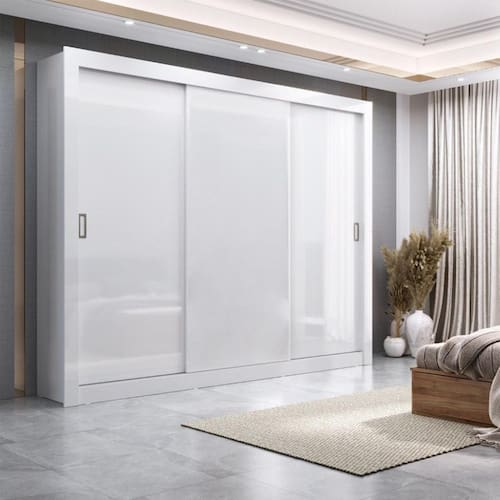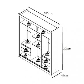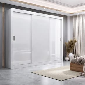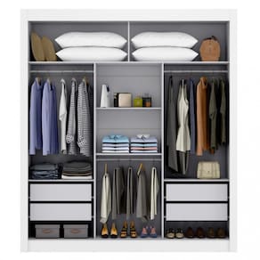 Caracter?sticas: 3 Portas de correr com sistema de roldanas com regulagem Corredi?as telesc?picas 2 Cabideiros em madeira 1 Calceiro em madeira 4 Gavetas Espa?o para sapatos Espa?o interno com divis?ria para ela-ele Estrutura em MDP Cada prateleira suporta peso de at? 6kg Cada gaveta suporta peso de at? 4kg