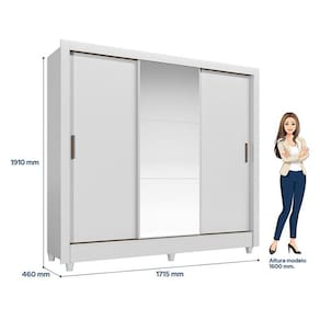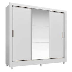 Guarda Roupa Casal 3 portas de correr com pés e espelho Italia Branco: Traz a praticidade do Roupeiro Itália, já com espelho na porta central para dar mais amplitude e funcionalidade. Perfeito para quartos compactos que pedem soluções inteligentes e acabamento que facilita a limpeza.