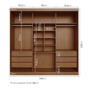 Com suas 3 portas de correr, disponíveis com ou sem espelho, e detalhes ripados em MDF que seguem as últimas tendências de design, o armário possui imponentes 242 cm de largura. Fabricado em MDP de 15mm e MDF de 25mm em seus detalhes ripados usinados, garantindo robustez e durabilidade excepcionais. Cada detalhe foi cuidadosamente planejado para proporcionar não apenas beleza, mas também praticidade, com várias divisões internas para organização eficiente de roupas e acessórios.