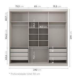 Um quarto moderno precisará de um móvel diferenciado, o Armário 3 portas de correr Samambaia traz a combinação perfeita ótima disposição interna e modernidade, esse móvel faz parte de uma linha de produtos que está disponível no mercado, sendo assim uma linha completa para formar seu ambiente e para total conforto, modernidade e durabilidade, o armário possui 3 portas de correr, com opções de portas lisas ou ripadas, com ou sem espelho que é uma tendência, tornando o móvel moderno, ele é confeccionado em MDP de 15mm e MDF para maior resistência, possui várias repartições para armazenar roupas e objetos, molduras nas portas laterais e centrais em MDF 25 mm. Materiais de 1ª qualidade que respeitam o meio ambiente. Acabamento da Prateleira: Pintura UV Escala de Brilho da Prateleira: Fosco Possui Cabideiros: 02 Acabamento da Gaveta: Pintura UV Escala de Brilho da Gaveta: Fosco Possui Organizador de Gaveta: Não Acabamento da Porta: Pintura UV Escala de Brilho da Porta: Fosco Material do Puxador da Porta: MDF Altura dos Pés: 8 cm Altura Máxima dos Pés: 8.0000 Ambiente Principal: Quarto codigo_ean: 7909903487136 Complexidade da Montagem: Alta: deve ser montado por um montador especializado Cor: Off White Cor do Produto: Off White Cor Interna: Off White Escala de Brilho: Fosco Gaveta com Chave: Não Itens Inclusos: 1 Guarda Roupa, Manual de Montagem e Kit Ferragens Linha ou Coleção: Samambaia Manual de Montagem e Instalação: https://product-hub-prd.madeiramadeira.com.br/880351/documents/7bf63f3c-08b5-4da8-8375-d7880cfe85dboupacasalsamambaiacabecasa.pdf Material da Gaveta: MDP Material da Porta: MDP Material da Prateleira: MDP Material dos Pés: MDP Material Principal: MDF/MDP modular: Não Necessita Montagem: Sim Origem do Produto: Nacional Peso: 211 kg Peso Máximo por Gaveta: 5 kg Peso Máximo por Prateleira: 15 kg Possui Calceiros: Não Possui Espelho: Não Possui Pés: Rodapé Possui Portas: Sim Possui Prateleiras: Sim Produto Montado: Sim Quantidade de Gavetas: 06 Gavetas Quantidade de Prateleiras: 06 Prateleiras Recomendações de Uso, Manutenção e Limpeza: A limpeza deve ser efetuada somente com um pano macio e seco. Não utilizar produtos abrasivos ou similares. Sistema de Montagem: Parafusos, cavilhas, pregos. Tipo de Corrediça da Gaveta: Metálica Telescópica Tipo de Dobradiça/Corrediça da Porta: Metálica Tipo de Gaveta: Interna Tipo de Guarda-Roupa: Casal Tipo de Puxador da Gaveta: Não Possui Tipo de Puxador da Porta: Embutido