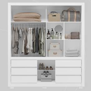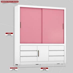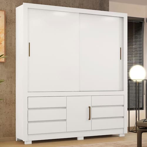Com três portas e seis gavetas espaçosas, oferece amplo armazenamento para roupas, acessórios e objetos pessoais.