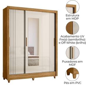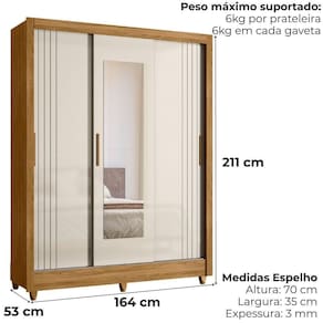 Projetado para atender às necessidades do dia a dia, o Guarda Roupa Casal Bolívia oferece espaço e modernidade. Estrutura em MDP (15/ 12 mm) e acabamento em pintura UV. Composto por portas de correr (central com espelho, laterais com frisos em baixo relevo) com abertura por trilho de alumínio, cabideiro interno (alumínio), prateleiras e gavetas com corrediças metálicas. Produto com dupla opção de montagem: pés em PVC ou sapatas plásticas (2 mm) conforme preferência do cliente. Este produto será entregue em 02 volumes.