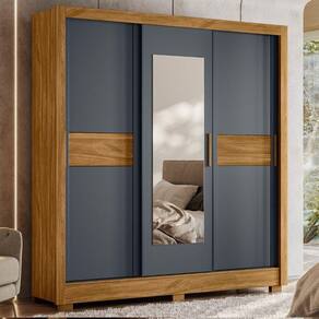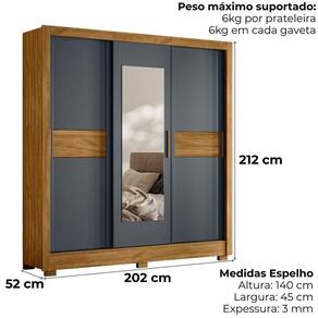 Aliando design moderno e praticidade, o Guarda Roupa Casal Bahamas proporciona organização completa. Estrutura em MDP (15/ 12 mm) e acabamento em pintura UV. Composto por portas de correr (central com espelho, laterais com detalhe em moldura MDF 25mm) com abertura por trilho de alumínio, cabideiro interno (alumínio), gavetas com corrediças metálicas e prateleiras. Produto com dupla opção de montagem: pés em PVC ou sapatas plásticas (2 mm) conforme preferência do cliente. Este produto será entregue em 03 volumes.
