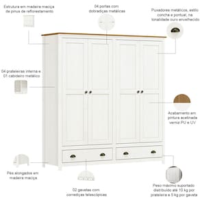 Fabricado em madeira maciça de alta resistência, esse guarda roupa 4 portas e 2 gavetas prova que espaços compactos podem ser incrivelmente funcionais e cheios de estilo. Com um cabideiro interno inteligente e prateleiras estratégicas, esse guarda roupa americano se adapta às suas necessidades - seja para organizar camisas, calças ou acessórios. Para completar, as gavetas inferiores mantêm itens pessoais sempre à mão, mas discretos, enquanto os puxadores em concha acrescentam um toque especial ao design.