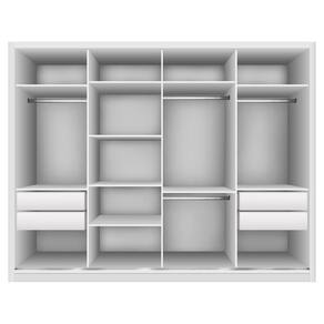 Características: Estilo; Moderno Garantia; 03 Meses Acabamento; Pintura Possui Pés; Não Possui Portas; Sim Tipo de Porta; Correr Possui Gavetas; Sim Tipo de Gaveta; Interna Escala de Brilho; Brilhante Possui Calceiros; Sim Material da Porta; MDP Origem do Produto; Nacional Possui Cabideiros; 03 Ambiente Principal; Quarto Material da Gaveta; MDP Material Principal; MDP Possui Prateleiras; Sim Acabamento da Porta; Pintura Acabamento da Gaveta; Pintura Tipo de Guarda-roupa; Casal Material da Prateleira; MDP Acabamento da Prateleira; Pintura Complexidade da Montagem; Alta: deve ser montado por um montador especializado Tipo de Puxador da Porta; Embutido Escala de Brilho da Porta; Brilhante Tipo de Puxador da Gaveta; Embutido Escala de Brilho da Gaveta; Brilhante Tipo de Corrediça da Gaveta; Metálica Telescópica Material do Puxador da Porta; Plástico Escala de Brilho da Prateleira; Brilhante Tipo de Dobradiça/Corrediça da Porta; Alumínio Possui Espelhos; Não Gaveta com Chave; Não Necessita Montagem; Sim Possui Painel de TV; Não Gaveta com Divisores; Não Possui Espelho Interno; Não Possui Organizador de Gaveta; Não Possui Espaço para Vestidos Longos; Não Itens Inclusos; 1 Guarda-Roupa e Manual de Montagem Sistema de Montagem; Parafusos e Minifix Peso Máximo por Gaveta; 10 kg Peso Máximo por Prateleira; 5 kg Possui Sapateira; Não Recomendações de Uso, Manutenção e Limpeza; Limpar com flanela limpa e seca. Não usar produtos abrasivos. Quantidade de Portas; 4 Quantidade de Gavetas; 4 Quantidade de Prateleiras; 8
