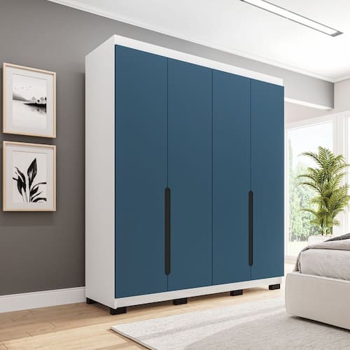 O Guarda-Roupa Madrid 4 Portas de Bater da Politorno Móveis é a escolha ideal para quem busca organização, design moderno e excelente aproveitamento de espaço: com 200 cm de altura, 161,1 cm de largura e 46 cm de profundidade, ele oferece uma estrutura funcional que se adapta perfeitamente a quartos de diferentes tamanhos. Seu grande diferencial está nos puxadores embutidos no próprio móvel, uma forte tendência de mercado que garante visual clean, sofisticado e atemporal, além de mais praticidade no uso diário. O acabamento em pintura UV proporciona maior durabilidade, resistência ao desgaste e um toque uniforme de alta qualidade, valorizando ainda mais o móvel. Disponível em 8 variações de cores, o Guarda-Roupa Madrid permite total personalização do ambiente. Acabamento da Prateleira: Pintura UV Escala de Brilho da Prateleira: Semi-Fosco Possui Cabideiros: Sim Acabamento da Gaveta: Pintura UV Escala de Brilho da Gaveta: Semi-Fosco Possui Organizador de Gaveta: Não Acabamento da Porta: Pintura UV Escala de Brilho da Porta: Semi-Fosco Material do Puxador da Porta: MDP Ambiente Principal: Quarto codigo_ean: 7900288302007 Complexidade da Montagem: Média: pode ser montado por mais de uma pessoa e/ou necessite de maior conhecimento para montagem Cor: Azul/Branco Cor da Porta: Azul Cor do Produto: Azul/Branco Cor Interna: Branco Escala de Brilho: Semi-Fosco Espessura da Estrutura (mm): 15 mm Espessura das Portas (mm): 15 mm Espessura das Prateleiras (mm): 15 mm Espessura do Fundo (mm): 3 mm Espessura do Fundo das Gavetas (mm): 3 mm Itens Inclusos: 1 Guarda-Roupa, Kit Ferragens, Manual de Montagem e Termo de Garantia Linha ou Coleção: Madrid Manual de Montagem e Instalação: https://product-hub-prd.madeiramadeira.com.br/402021767/documents/32bc1a3a-64ee-43a5-9612-b2ef4ba34e9a3344436622417659797680914.pdf Marca: Politorno Material da Gaveta: MDP Material da Porta: MDP Material da Prateleira: MDP Material Principal: MDP modular: Não Necessita Montagem: Sim Origem do Produto: Nacional Peso: 76,77 kg Peso Máximo por Gaveta: 5 kg Peso Máximo por Prateleira: 5 kg Possui Calceiros: Sim Possui Espelho: Não Possui Pés: Não Possui Portas: Sim Possui Prateleiras: Sim Produto Montado: Sim Quantidade de Cabideiros: 04 Cabideiros Quantidade de Gavetas: 04 Gavetas Quantidade de Prateleiras: 08 Prateleiras Recomendações de Uso, Manutenção e Limpeza: Utilize um pano macio umedecido com água e sabão neutro, seguido de pano seco. Não utilize produtos químicos ou abrasivos para limpeza, pois estes danificam o revestimento do móvel. Sistema de Montagem: Cavilha, Parafuso, Minifix e prego. Tipo de Corrediça da Gaveta: Metálica Telescópica Tipo de Dobradiça/Corrediça da Porta: Metálica Tipo de Gaveta: Interna Tipo de Guarda-Roupa: Casal Tipo de Puxador da Gaveta: Não Possui Tipo de Puxador da Porta: Embutido Marca: Não Informado