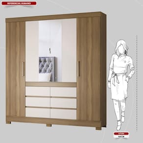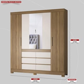 Com quatro portas e seis gavetas espaçosas, oferece amplo armazenamento para roupas, acessórios e objetos pessoais.