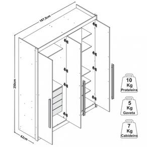 Dimensões: Altura: 250 cm Largura: 187,5 cm Profundidade: 62 cm Peso: 201,57 kg
