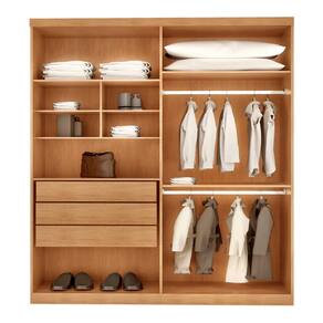 Características: 3 Gavetas 4 Portas Acabamento em pintura UV Cabideiros em alumínio Corrediças telescópicas Dobradiças metálicas de pressão Estrutura 100 em MDF Puxadores em madeira, reforço no fundo das gavetas