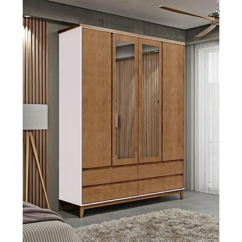 Guarda-Roupa Casal 4 Portas Espelhos 4 Gavetas Off White/Freijó Prata Madeira Pinus com MDF - Finestra