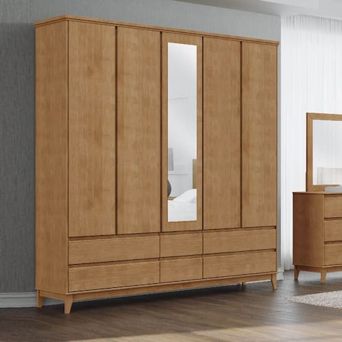 O Guarda-Roupa Casal com 5 Portas, Espelhos e 6 Gavetas, em Madeira Pinus com MDF, oferece amplo espaço e funcionalidade para organizar roupas e acessórios. As portas com espelhos adicionam sofisticação e ajudam a ampliar o ambiente. Seu design robusto e elegante garante durabilidade, sendo a escolha ideal para quem busca praticidade e estilo no quarto.