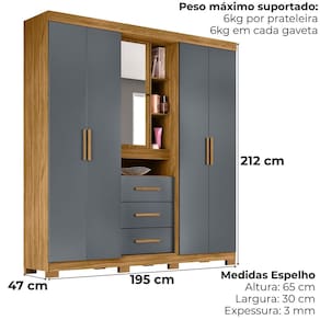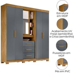 Aliando design moderno e praticidade, o Guarda Roupa Casal Eldorado proporciona organização completa. Estrutura em MDP (15/ 12 mm) e acabamento em pintura UV. Composto por portas com dobradiças metálicas (sendo uma das portas com espelho e trava por chave, para armazenamento de objetos), cabideiro interno (alumínio), prateleiras e gavetas com corrediças metálicas além de nichos centrais para decorações e afins. Produto com dupla opção de montagem: pés em PVC ou sapatas plásticas (2 mm) conforme preferência do cliente. Este produto será entregue em 04 volumes.