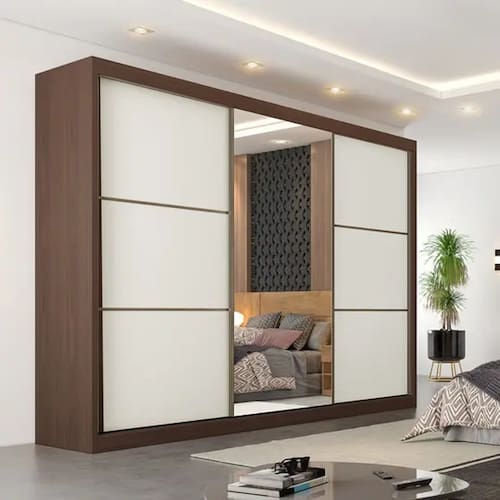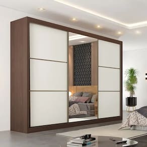 Particularidades do guarda-roupa: Características: - 100% MDF; - Gavetas com corrediças telescópicas; - Seis gavetas com corrediças telescópicas; - Portas espelhadas com moldura em alumínio; - Cabideiros em alumínio; - Roldanas com sistema de regulagem; - Antiempeno; - Trilho superior e inferior em alumínio; - Espelhos com película de segurança ;