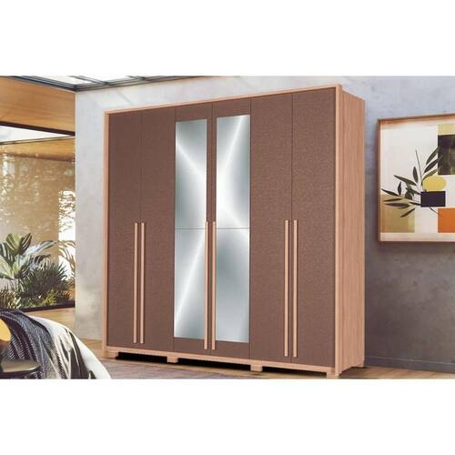 Material dos Cabideiros - Cabideira Metálico Tipo de Porta do Guarda-Roupa - Portas de Bater Tipo de Dobradiças - Dobradiça Slowmotion Diferenciais das Portas - Porta c/ Espelho Quantidade de Portas - 6 Portas de Abrir Quantidade de Portas com Espelho - 2 Portas com Espelho Tipo de Espelho - Espelho Externo Quantidade de Espelhos - 4 Espelhos Tipo de Corrediça - c/ Corrediças Telescópicas Quantidade de Gavetas - 4 Gavetas Material de Estrutura Fundo Gaveta - Em HDF Quantidade de Pés - 8 pés