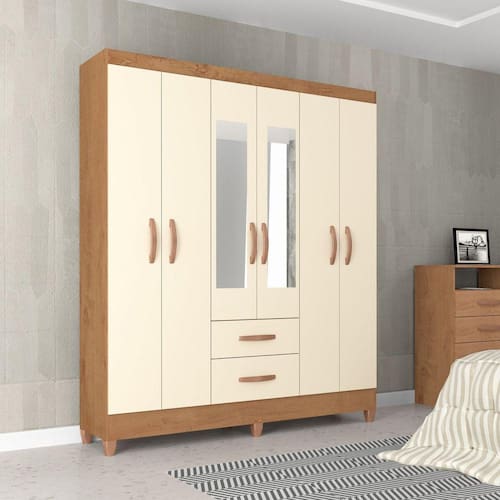 Roupeiro em madeira de MDP, 06 portas (dobradiças), 02 gavetas, corrediças metálicas, com pés, espelhos, puxadores bronze, 4 prateleiras, cabideiro, espaço para calçados, pintura UV, acabamento rustico ou brilho, pés em PVC. Acabamento da Prateleira: Pintura UV Escala de Brilho da Prateleira: Fosco Possui Cabideiros: 01 Acabamento da Gaveta: Pintura UV Escala de Brilho da Gaveta: Brilhante Material do Puxador da Gaveta: PVC Possui Organizador de Gaveta: Não Acabamento da Porta: Pintura UV Escala de Brilho da Porta: Brilhante Material do Puxador da Porta: PVC Acabamento dos Pés: Pintura Altura do Espelho: 60 cm Altura dos Pés: 5 cm Ambiente Principal: Quarto Complexidade da Montagem: Média: pode ser montado por mais de uma pessoa e/ou necessite de maior conhecimento para montagem Cor: Canelato Rústico/Marrom Off White Cor do Produto: Canelato Rústico/Marrom Off White Cor Interna: Ártico Escala de Brilho: Semi-Brilho Espessura do Espelho: 3 mm Fita Integrada: Sim Formato do Espelho: Quadrado Gaveta com Chave: Não Itens Inclusos: 1 Guarda Roupa, Kit Ferragens e Manual de Montagem Largura do Espelho: 15 cm Linha ou Coleção: Light Manual de Montagem e Instalação: https://cdn2.madeiramadeira.com.br/atributo/atualle-moveis/1204308-manual-de-montagem-roupeiro-6p-fortaleza-bc-3506.pdf Material da Gaveta: MDP Material da Porta: MDP Material da Prateleira: MDP Material dos Pés: PVC Material Principal: MDP Necessita Montagem: Sim Origem do Produto: Nacional Peso: 61,52 kg Peso Máximo por Gaveta: 4 kg Peso Máximo por Prateleira: 9 kg Possui Calceiros: Não Possui Espelho: Sim Possui Pés: 06 Possui Portas: 06 Possui Prateleiras: 04 Quantidade de Espelho: 02 Espelhos com Tamanhos Iguais Recomendações de Uso, Manutenção e Limpeza: Para limpar, utilizar somente um pano úmido Sapatas Niveladoras: Não Sistema de Montagem: Parafusos, pregos, cavilhas, pinos. Tipo de Corrediça da Gaveta: Metálica Simples Tipo de Dobradiça/Corrediça da Porta: Metálica Tipo de Fixação do Espelho: Fita Dupla Face Tipo de Gaveta: Externa Tipo de Guarda-Roupa: Casal Tipo de Puxador da Gaveta: Externo Tipo de Puxador da Porta: Externo