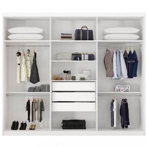 Características: MDP 12 mm e 15 mm 6 portas 3 gavetas Pintura UV Dobradiças metálicas Corrediças telescópicas Cabideiros metálicos Pés de plástico