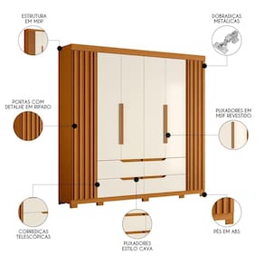 Esse guarda roupa casal grande foi projetado com as portas laterais com detalhe ripado, que adicionam um toque de charme e estilo ao ambiente. Já as 4 gavetas espaçosas possuem puxadores estilo cava, proporcionando um visual moderno e sofisticado. Além disso, as corrediças telescópicas garantem um deslizamento suave e sem ruídos. Na parte interna, com os cabideiros em alumínio, você terá amplo espaço para pendurar suas roupas sem se preocupar com amassados, ao passo que as diversas prateleiras são uma ótima opção para roupas que podem dobrar ou até mesmo para dispor calçados, bolsas e até itens de maquiagem. Para completar, os pés inclusos oferecem estabilidade e durabilidade ao móvel, além de facilitar a limpeza do ambiente.