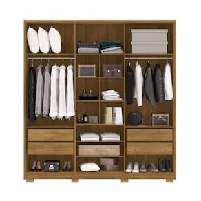 Com seis portas e quatro gavetas espaçosas, oferece amplo armazenamento para roupas, acessórios e objetos pessoais.