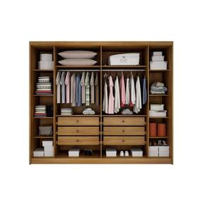 Particularidades do guarda-roupa: Características: - 100% MDF; - Colunado em 25mm; - Puxadores com acabamento amadeirado; - 6 Gavetas internas com puxadores; - Corrediças telescópicas; - Dobradiça de pressão de 35mm; - Fundo inteiriço; - Cabideiros em alumínio;