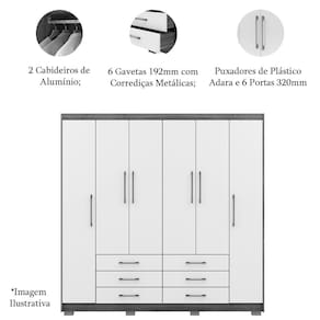 • Pintura: Possui 2 Cabideiros de Alumínio, Puxadores de Plástico Adara, Portas 320mm e Gavetas 192mm;